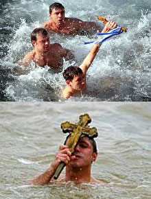 crucifix into the waters. Young men brave the cold and